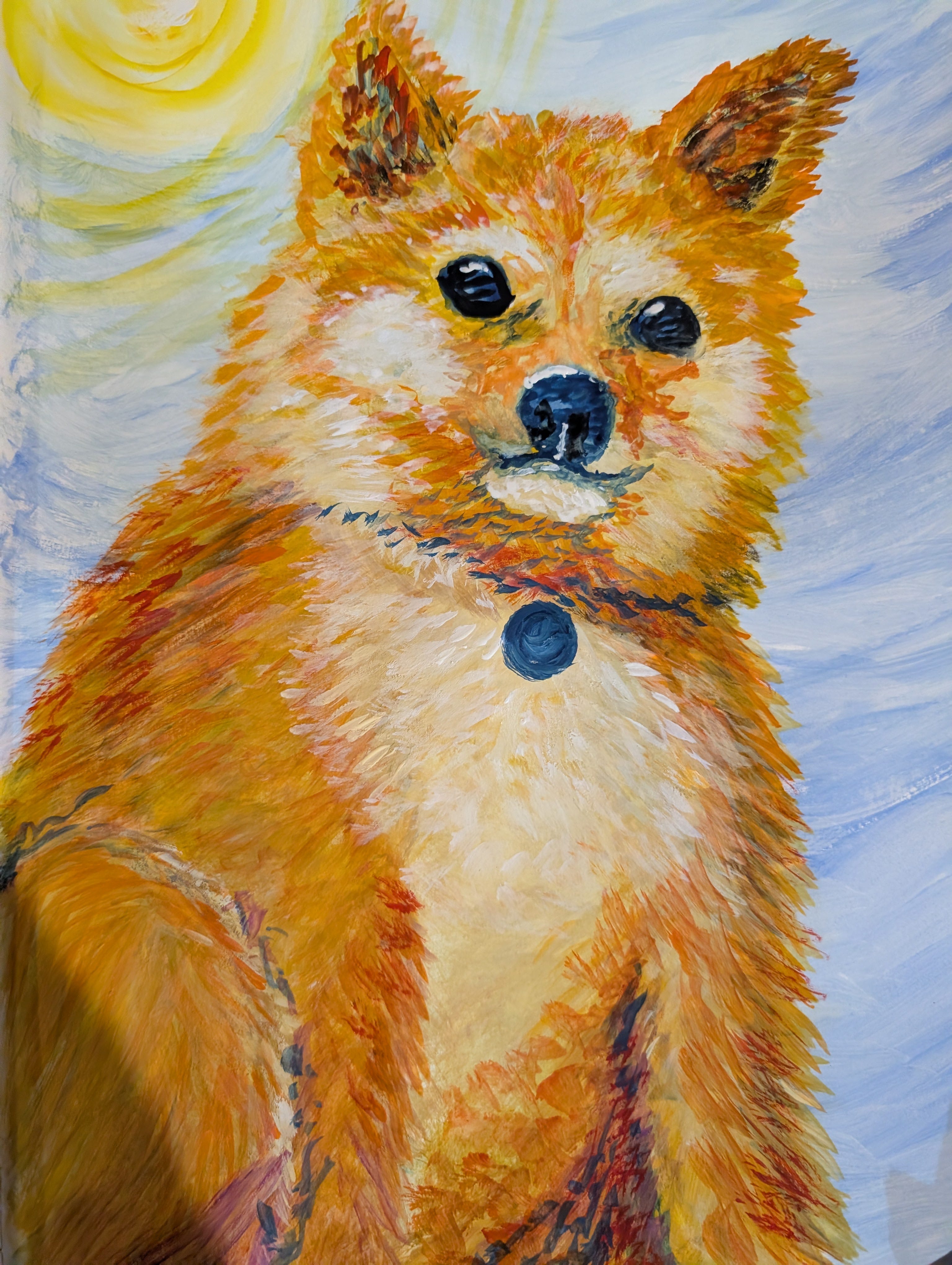 The inclusion of a collar with a simple, dark round tag grounds the image in realism while maintaining the vibrancy of the overall style. Visually, the piece merges Post-Impressionist and Expressionist influences, using color intensity and visible brushstrokes that emphasize emotional connection and energetic presence. This approach suits Blaze as a subject: a protector and companion who embodies steadfastness and spirited loyalty.